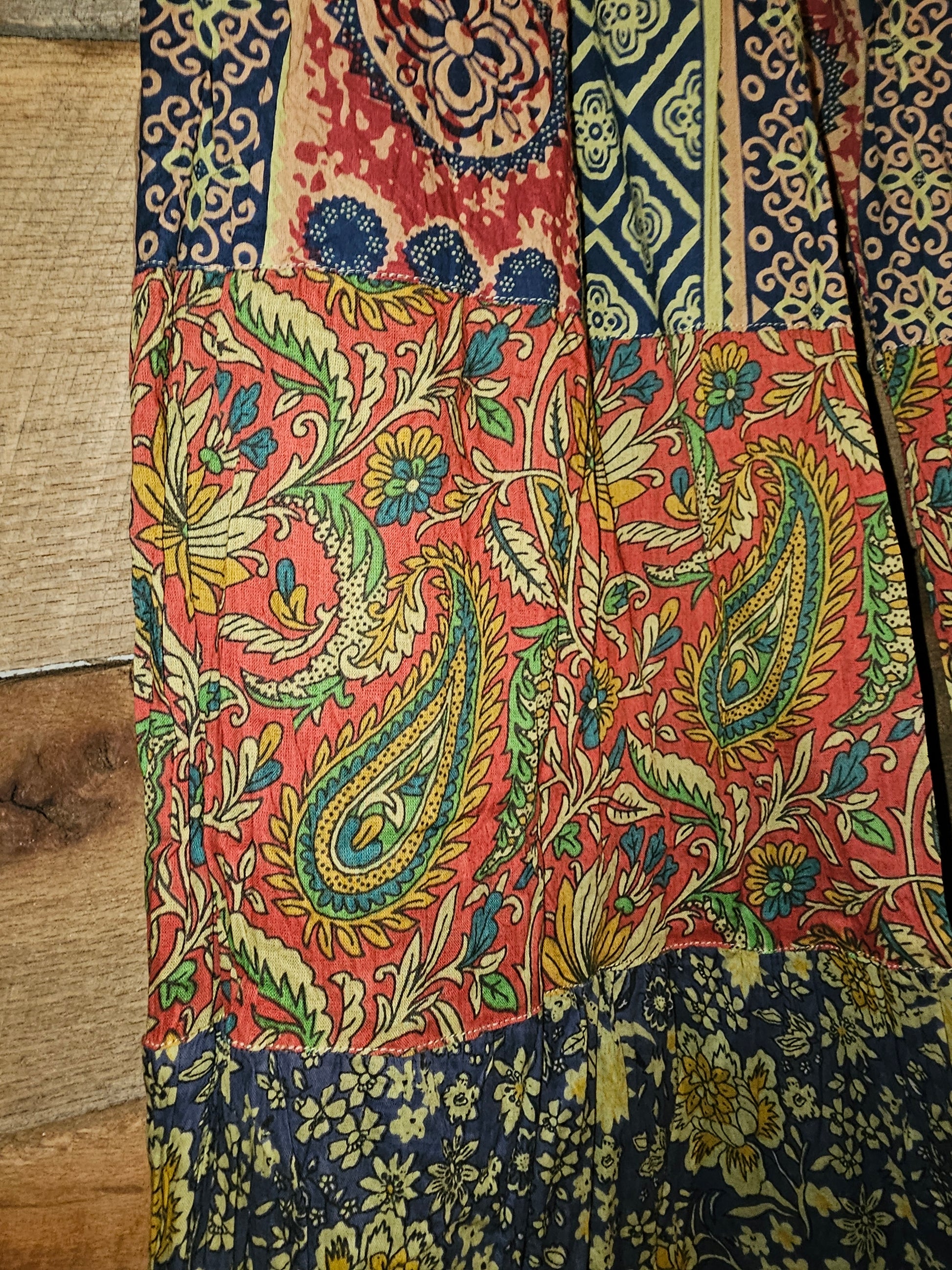 Hand made women's size medium/large in the exotic subcontinent of India from 100% cotton. These have a drawstring waist and flare legs to the bottom. Skilled craftspeople pay close attention to detail as they have everything sewed up tight! Vintage style that brings back the clothing found in hippie shops of the 1960's! A myriad of colors & ethnic flavors tell a story of coming together in these strikingly attractive patchwork pants. Patchwork items really exemplify coming together in peace & harmony, helping communities, reducing waste by utilizing every inch of available material & keeping the groovy hippie vibe alive! WANDER with PEACE, LOVE, & HAPPINESS!!!