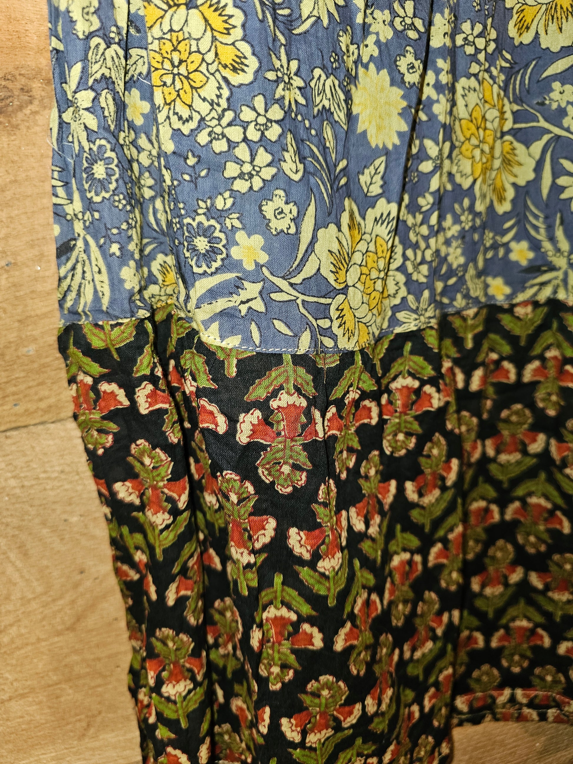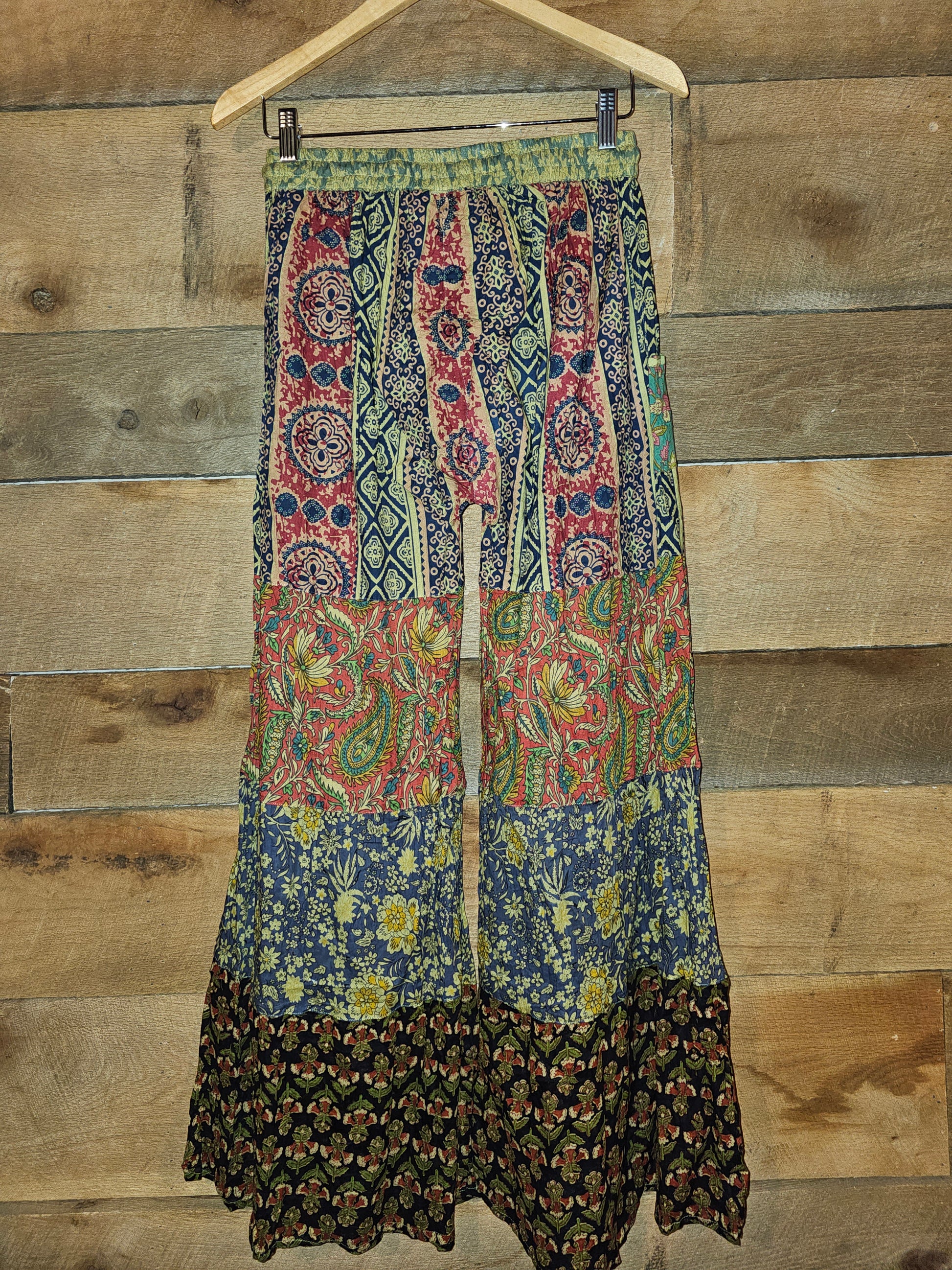 Hand made women's size medium/large in the exotic subcontinent of India from 100% cotton. These have a drawstring waist and flare legs to the bottom. Skilled craftspeople pay close attention to detail as they have everything sewed up tight! Vintage style that brings back the clothing found in hippie shops of the 1960's! A myriad of colors & ethnic flavors tell a story of coming together in these strikingly attractive patchwork pants. Patchwork items really exemplify coming together in peace & harmony, helping communities, reducing waste by utilizing every inch of available material & keeping the groovy hippie vibe alive! WANDER with PEACE, LOVE, & HAPPINESS!!!