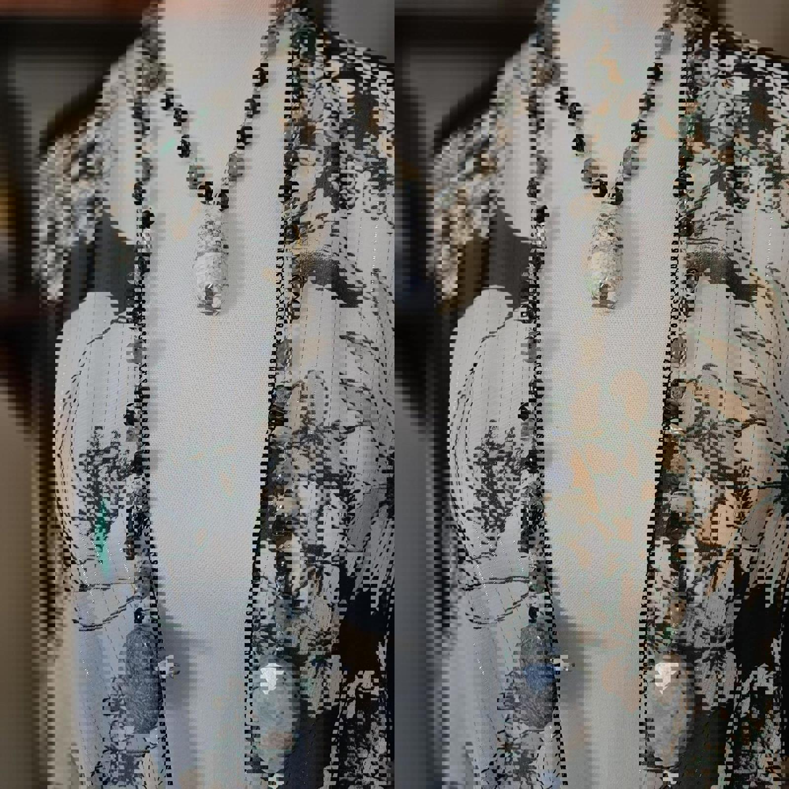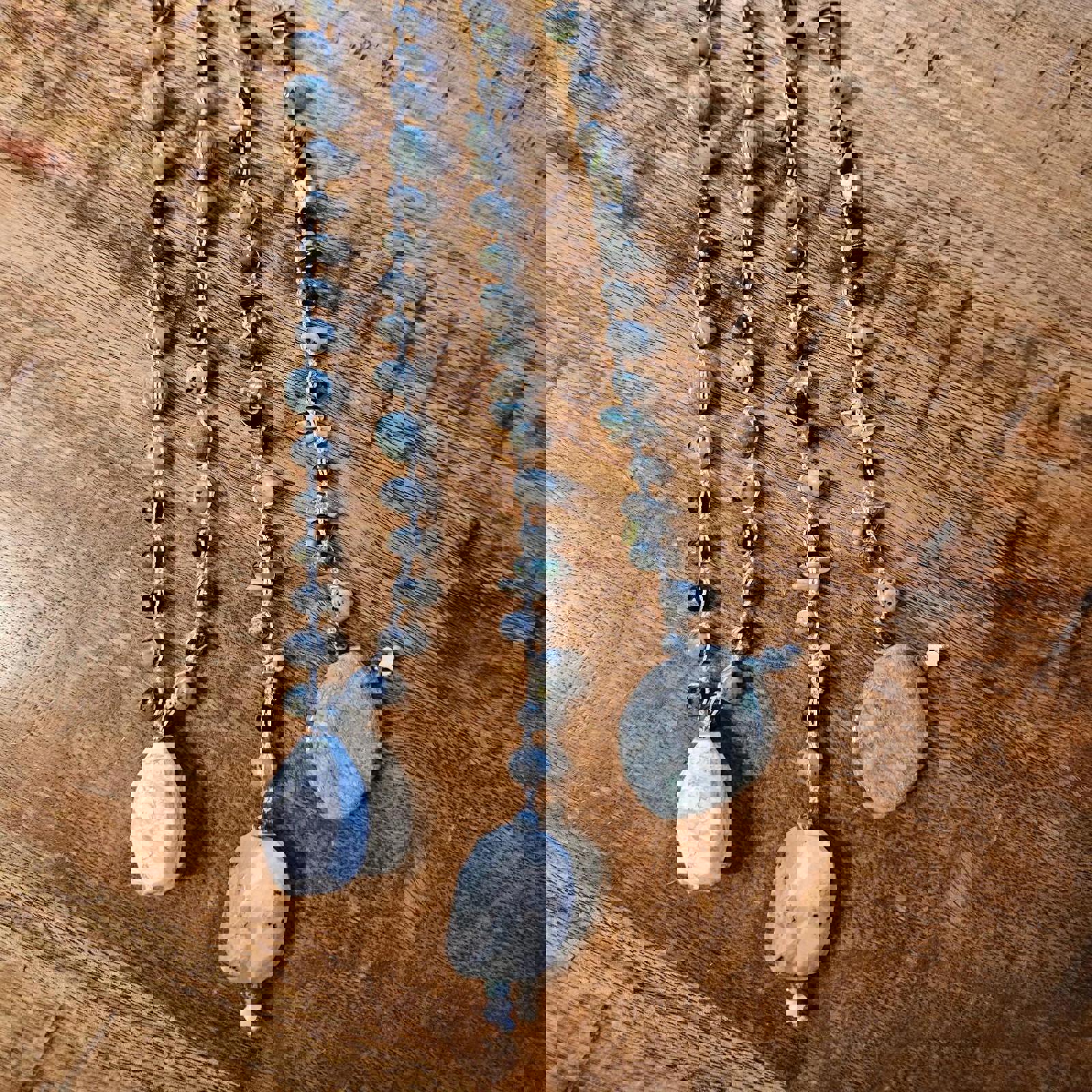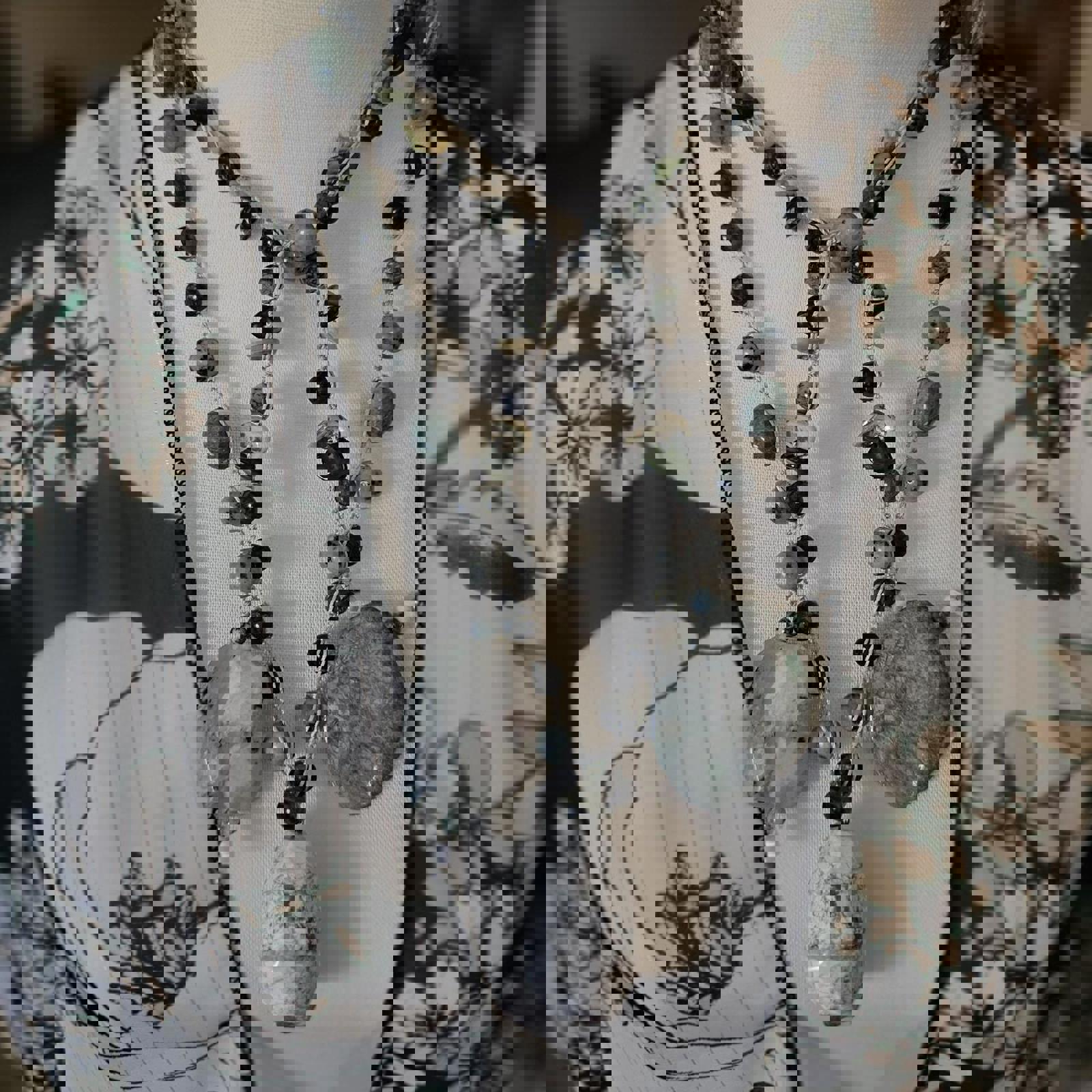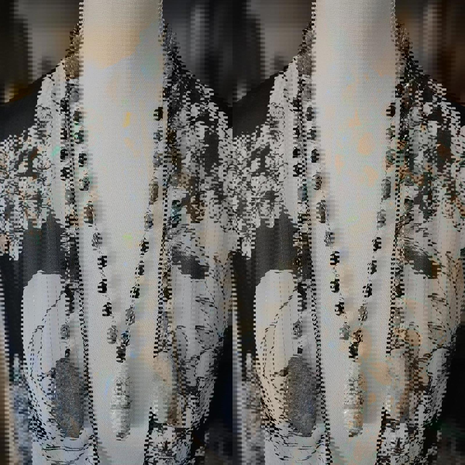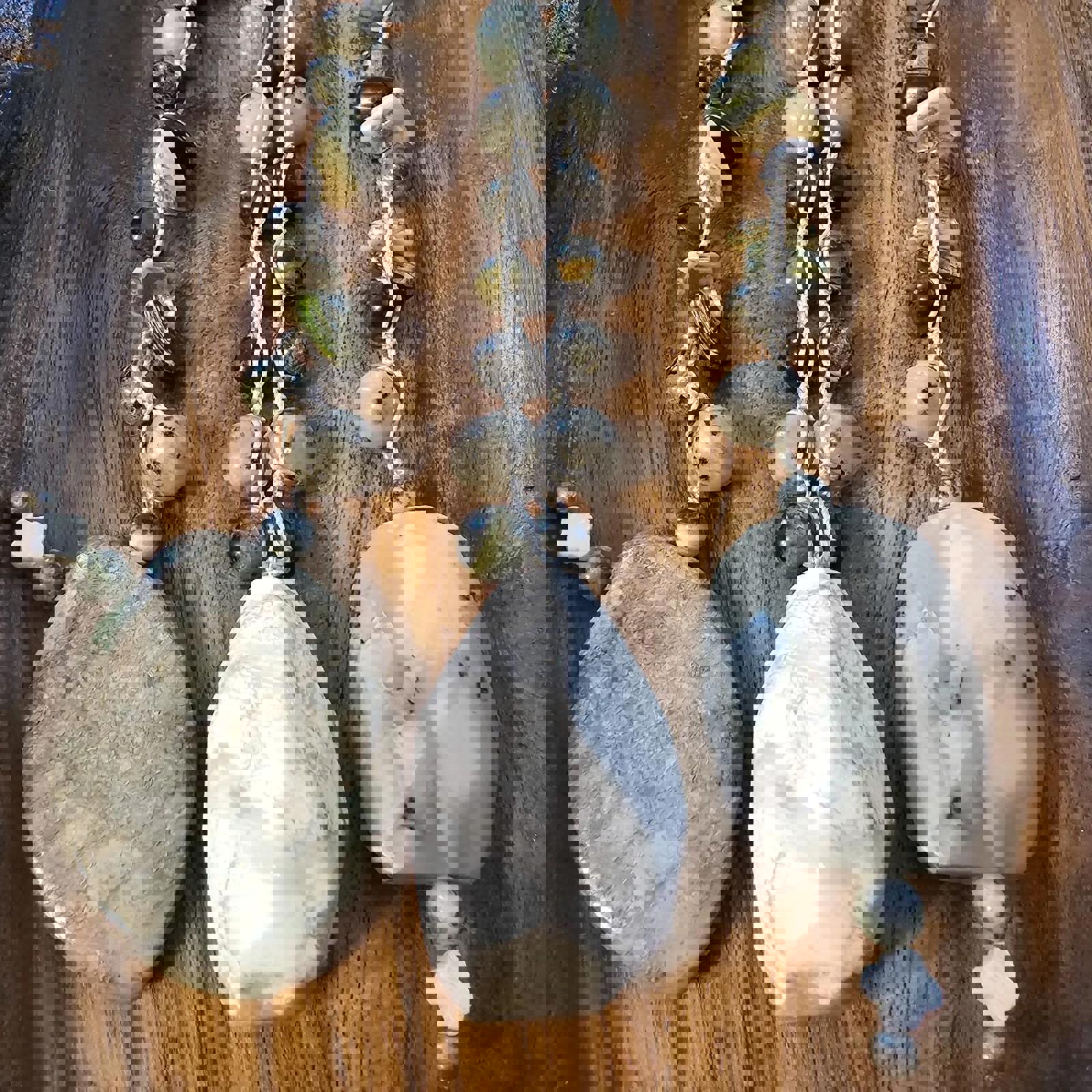 HANDMADE NECKLACE MADE WITH AUTHENTIC VINTAGE MOSS AGATE GEMSTONES TO BRING YOU GROUNDING TO MOTHER EARTH, PEACE, AND TRANQUILITY, AND GREEN ADVENTURINE FOR ABUNDANCE OF THE MIND, BODY, AND SOUL. IT CAN BE WORN MANY WAYS WRAPPED ONCE OR MULTIPLE TIMES AROUND THE NECK AND DRAPPED TO THE FRONT OR BACK. NEVER WORRY ABOUT HAVING ANYONE ASSIST TAKING ON OR OFF YOUR NECKLACE AGAIN WITH THE VERSATILITY THIS HANDCRAFTED ONE-OF-A-KIND PIECE OFFERS. EACH STONE WAS HAND SELECTED, SEWN, AND MADE WITH LOVE ❤️ $222 PLUS SHIPPING.